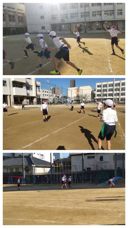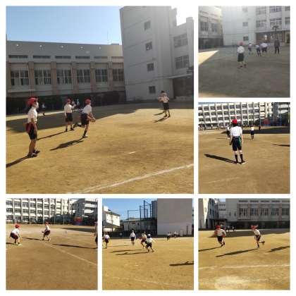 今日の学習は、タグラグビーでした。最初にめあての確認をみんなでして、グループでの学習をしました。パスやトライの練習のあと、グループで2対1をしました。パスとフェイントをうまく使って相手を抜きます。その後、作戦を立てて3対3のゲームをしました。ラグビーなので前にパスできないのが難しいようでした。守る方もタグをとってしっかり守っていました。まだ始めたばかりなのでこれからどんどんグループで話し合ってチーム力を高めていってほしいです。