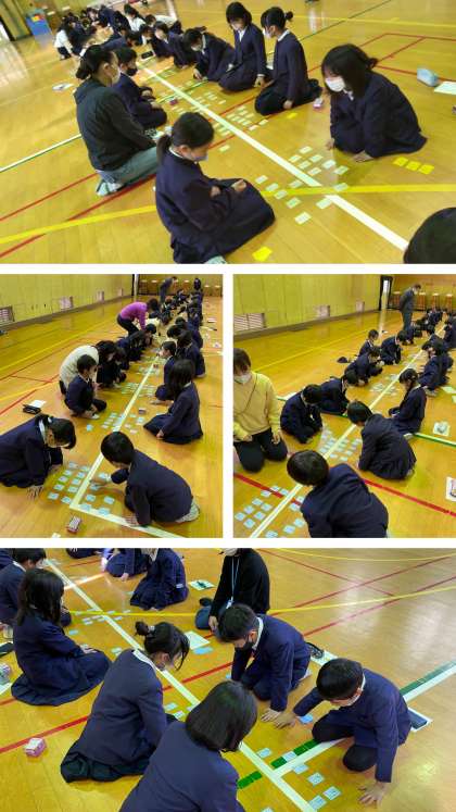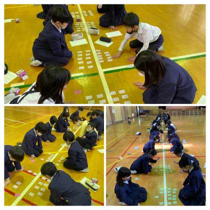 今日は、4年生で百人一首大会をしました。お手伝いにPTA活動の一環として3人来ていただきました。昨年PTAに買っていただいた五色百人一首を使って全色5回対戦しました。1回終わるごとに静まりみんな真剣勝負でした。お手伝いのお母さんたちにも詠んでいただき、お休みの人のところに入ってもらって対戦もしてもらいました。5色合計して60枚以上取った人が二人いたので、舞台の上でサプライズでお母さんに対戦していただきました。終わったあとの感想では、「たくさん取れて嬉しかったです」「2組の人とできたので楽しかったです」「勝っても負けても楽しめました」という声が聞かれました。お手伝いいただいてた保護者の皆様ご協力いただきありがとうございました。