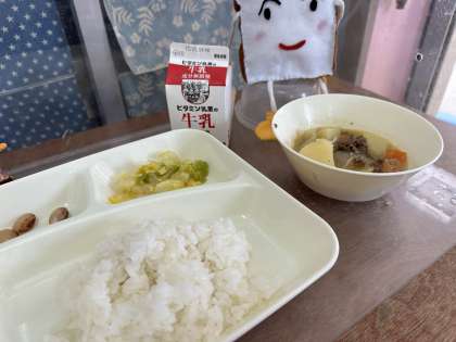 今日の給食は、肉じゃが、はくさいのゆず風味、とら豆の煮ものです。