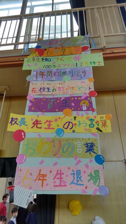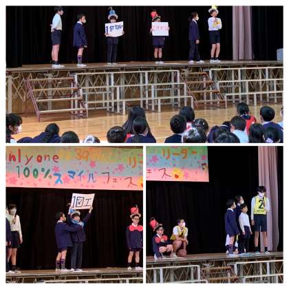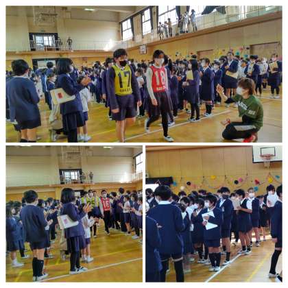 今年は、「Only one 39みんなのリーダー 100%スマイルフェス」と称して卒業を祝う会が5時間目に行われました。最初は、「6年生のことを知り尽くせ」と題してワン・ツー・スリー博士によるクイズでした。6年生の一番思い出に残っている行事、好きな教科、6年間で一番身長が伸びた人を当てるクイズでした。6年生と最後のゲームになりました。みんなで相談しながら考えました。一番身長が伸びた人は40cm伸びたそうです。そして、写真は一番伸びた人と同じ身長の1年生に舞台に上がってもらって大きくなったことを実感しました。