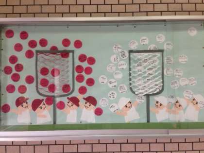 玄関の掲示は、5年生が当番です。赤玉、白玉には、各自の2学期の目標が書いてあります。2学期スタートにふさわしい掲示ですね。