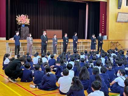 新しい教職員が着任し、一人ずつ自己紹介をしました。その後、始業式では、たてわり班を中心にみんなで繋がってみんなで笑顔いっぱいの中野小学校をつくっていきましょうと話しました。
