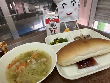 今日の給食は、豚肉のガーリック焼き、スープ、さんどまめとコーンのサラダです。