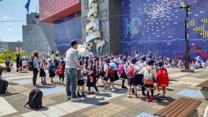 昨日の雨も上がって今日は遠足日和のお天気です。2年生は、海遊館にやってきました。こどもの日が近いので、鯉のぼりならず海遊館の生き物たちが空を泳いでいました。班に分かれて出発です。
