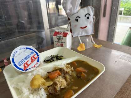 今日の給食は、牛肉と大豆のカレーライス、キャベツとひじきドレッシング、ヨーグルトです。
