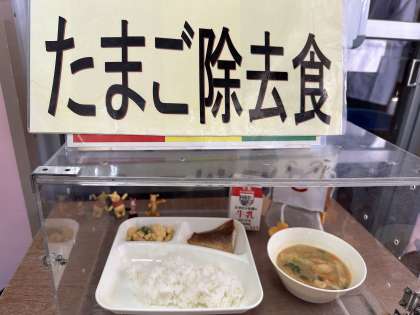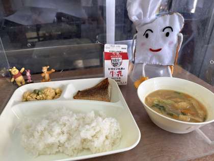 今日の給食は、あかうおのしょうゆだれかけ、みそ汁、えんどうの卵とじです。