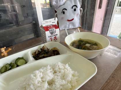 今日の給食は、プルコギ、とうふのわかめのスープ、きゅうりの甘酢づけです。
