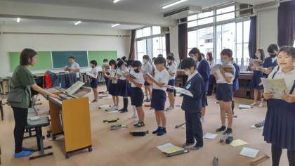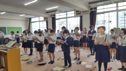 夢色シンフォニーの合唱です。上のパート下のパートに分かれて歌いました。前の時間よりしっかり歌えた子がたくさんいました。