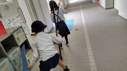今年は2年生が職員室前の廊下を清掃しています。ゴミを見つけて一生懸命掃いたり、くつばこを拭いてくれたりしてピカピカです。