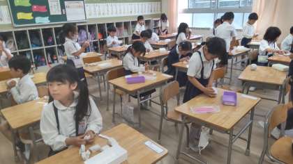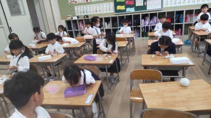 今日は、雨で遠足が延期になりましたが、子どもたちは頑張って学習しています。粘土で球をつくるのに挑戦しました。小さい球や大きい球と体いっぱい使ってつくりました。