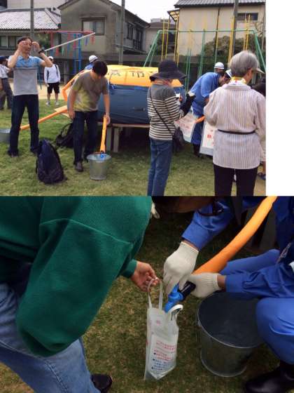 運動場には起震車や給水車が並び、講堂ではマンホールトイレ、雨水タンクなどの防災グッズが展示されました。