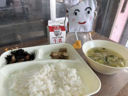 今日の給食は、さけのごまみそ焼き、五目汁、ひじきのいため煮です。
