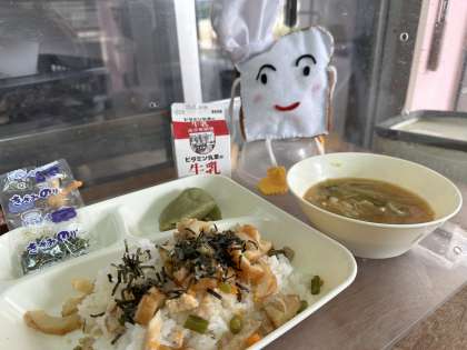 今日の給食は、かやくご飯、みそ汁、まっ茶ういろうです。