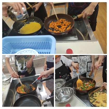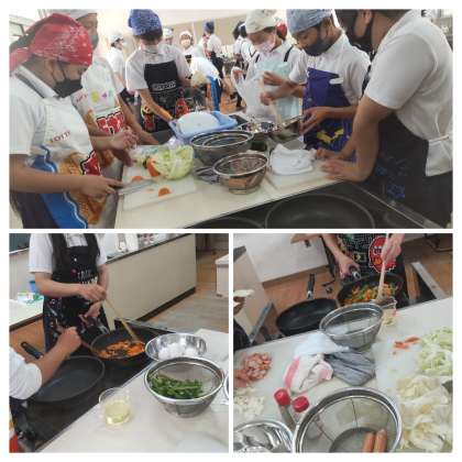 今日は「朝ごはんをつくろう」ということで野菜炒めと卵料理をしました。にんじんの短冊切りに苦労していましたが、6年生になってどの班も協力しながら上手に進めていました。卵料理はスクランブルエッグと卵焼きに挑戦していました。野菜炒めは彩りよくにんじん、ピーマン、キャベツにソーセージを塩コショウで味付けしました。