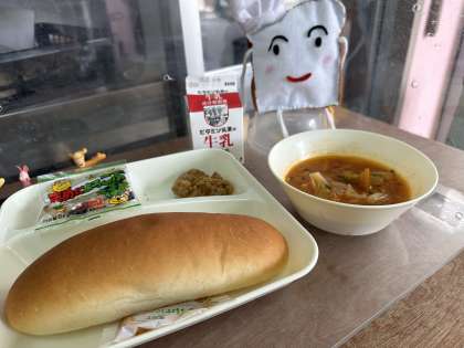 今日の給食は、一口トンカツ、ミネストローネ、豆こんぶです。