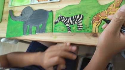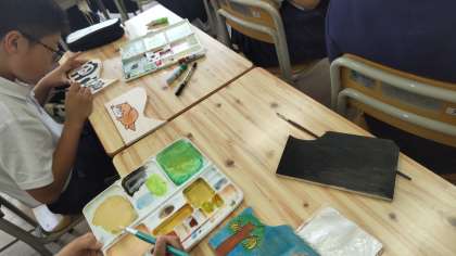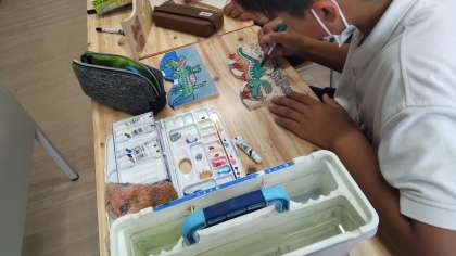 切り取った板に思い思いの絵を描いて彩色しています。