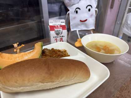 今日の給食は、かぼちゃのミートグラタン、鶏肉と野菜のスープ、クインシーメロンです。