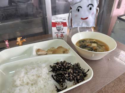 今日の給食は、鶏肉のおろしじょうゆかけ、みそ汁、魚ひじきそぼろです。