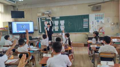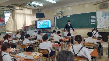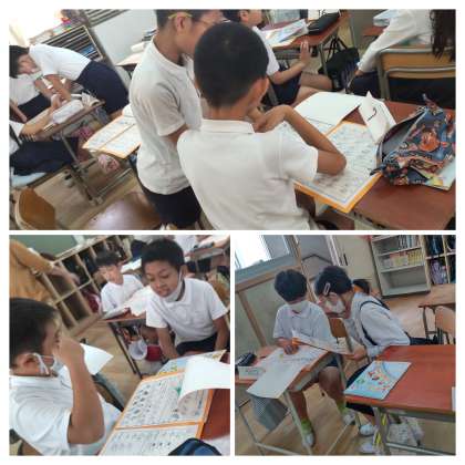 今日は、教育実習の先生の授業でした。「天気について知ろう」というめあてで学習しました。ダイストークで隣の人と質問しあい、天気についての言い方を学習しました。くり返し話して晴れ、曇り、雨、雪の言い方を知りました。ビンゴゲームはたくさんビンゴてきてもりあがりました。今日お家でrainyと夕方からの天気を話してくれてるかな?
