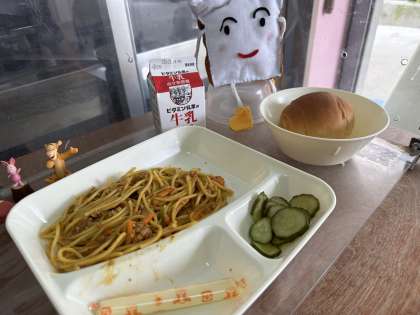 今日の給食は、カレースパゲッティ、きゅうりのピクルス、棒チーズです。