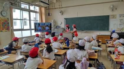 オープニングセレモニーです。たてわり班の教室で注意事項等確認しました。