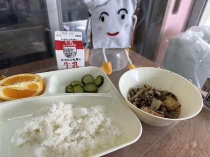 今日の給食は、すき焼き煮、きゅうりのしょうがづけ、オレンジです。