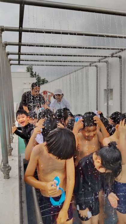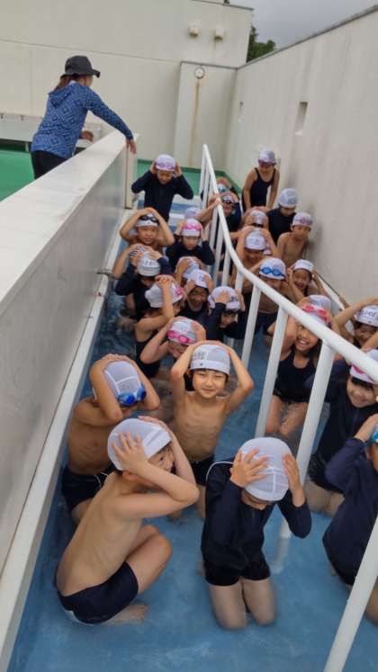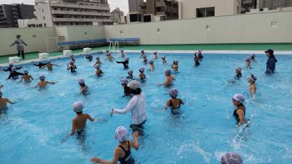 何とか雨が止んで2回目のプール学習です。シャワーは冷たかったのですが、中に入るとだんだん慣れてきて「もうあがるの」「もっと入りたい!」など声があがっていました。走ったりカニ歩きしたり、顔つけもがんばりました。