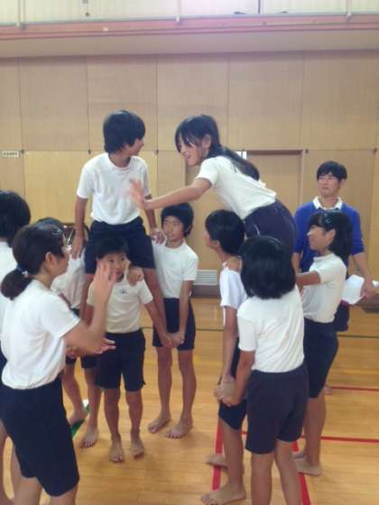 ついに塔を立てました。6年生は、一番下に6人の土台、その上に3人が乗り、そしててっぺんに1人が立つ3段塔です。全員が立つので、かなりの高さです。安全に配慮し、練習をしていきたいです。 5年生も同じく3段塔です。6年生との違いは、一番下の6人が四つん這いになり円形を作ることにより、6年生との高さの違いを表します。5年生にとってやりがいのある技です。