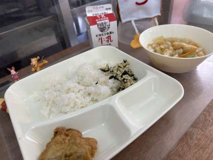 今日の給食は、白身魚、すまし汁、とりなっ葉いためです。