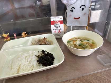 今日は、豚肉と甘辛焼き、五目汁、のりのつくだ煮です。