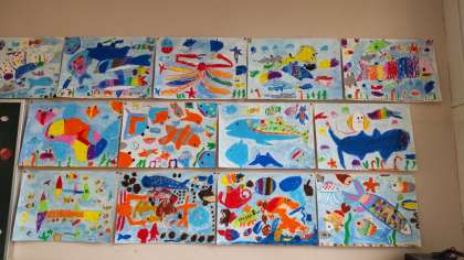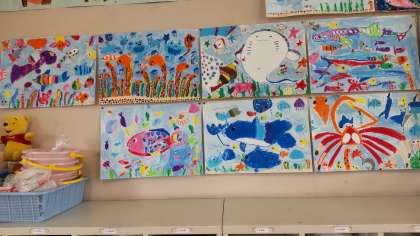 海遊館で見た水の中で生活する生き物を画用紙いっぱいに描きました。