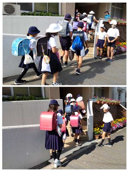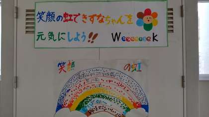 今年のあいさつ運動は「エガオの虹できずなちゃんを元気にしよう!! Weeeeeeekを」スローガンにして昨日から始まっています。朝から学校中に元気なあいさつが響いています。あいさつをしたらシールを貼り学年ごとの色で虹をかけていきます。