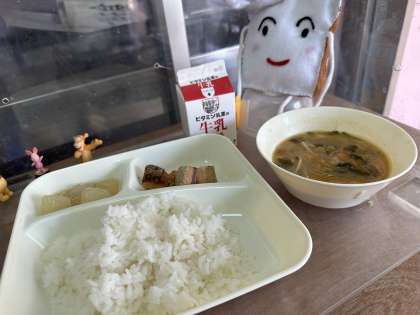 今日の給食は、さけのつけ焼き、みそ汁、とうがんの煮ものです。