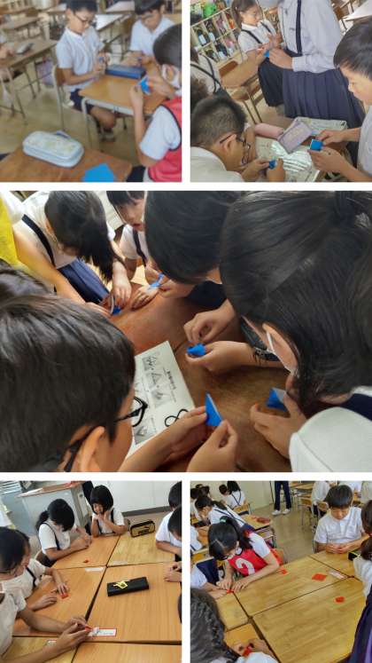 、たてわり班で協力して鶴を折りました。この鶴は、6年生が、修学旅行に持っていき奉納してくれることになっています。10月まで心を込めてみんなで折っていく予定です。