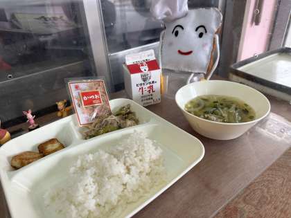 今日の給食は、ゴーヤチャンプルー、五目汁、あつあげのしょうがじょうゆがけです。