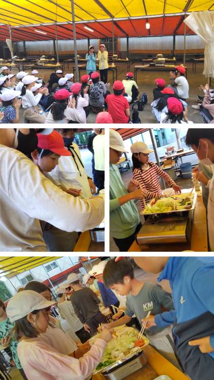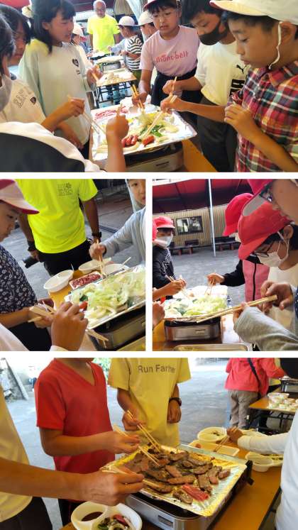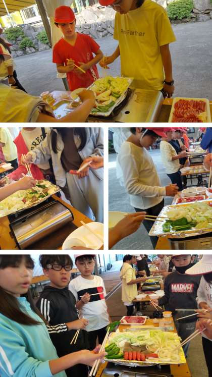 いよいよ夕食。バーベキューです。いただきますをした後、野菜、お肉と協力して焼き始めました。