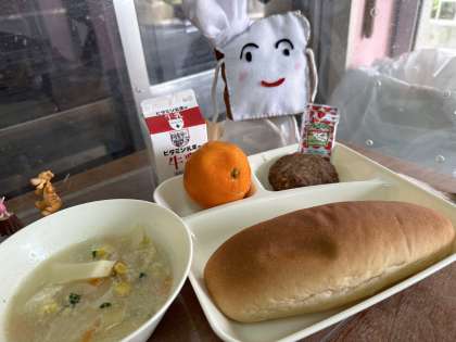 今日の給食は、焼きハンバーグ、豆乳スープ、みかん(れいとう)です。
