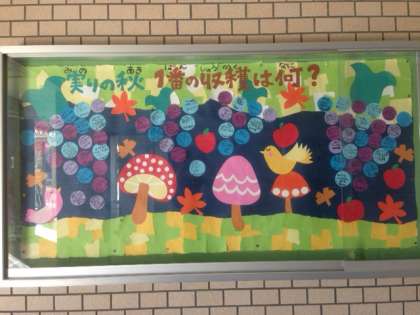 運動会バージョンの玄関掲示から10月の新しい掲示に変わりましたよ。担当は、3年生です。