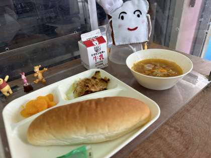 今日の給食は、豆乳マカロニグラタン(米粉)、トマトスープ、みかん(かんづめ)です。