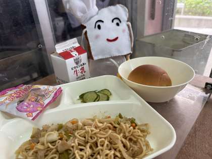 今日の給食は、焼きそば、きゅうりのしょうがづけ、いもけんぴフィッシュです。