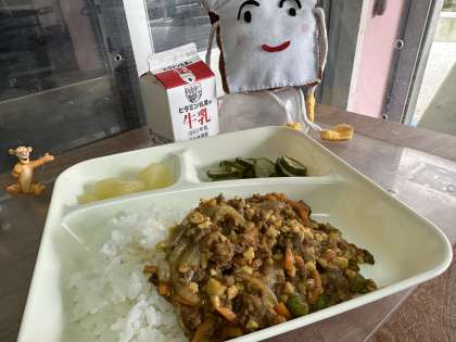 今日の給食は、大豆入りキーマカレーライス(米粉)、きゅうりのサラダ、洋なし(かんづめ)です。