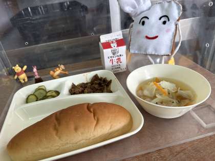 今日の給食は、牛肉のデミグラスソース煮、スープ、きゅうりのピクルスです。