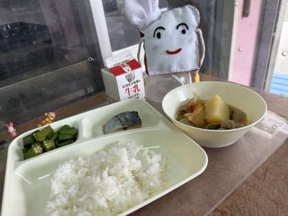 今日の給食は、さごしの塩焼き、含め煮、オクラのいためものです。