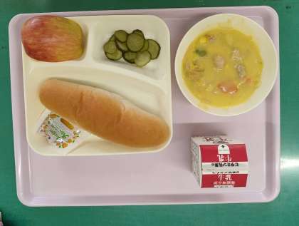 豆乳コーンクリームシチュー(米粉)、きゅうりのバジル風味サラダ、りんご