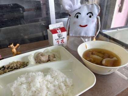 今日の給食は、鶏肉のゆず塩焼き、ソーキ汁、ツナ大豆そぼろです。