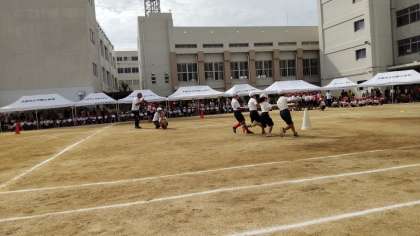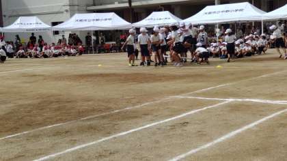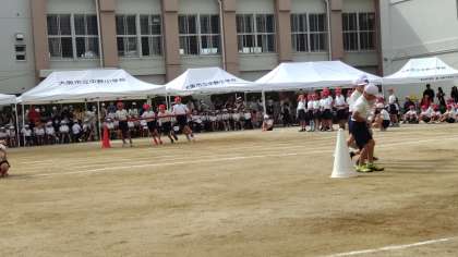 3年生と4年生がそれぞれ力を合わせて棒を運びます。コーンの回りを廻るのが難しく遠心力で飛ばされそうになるのを踏ん張っていました。