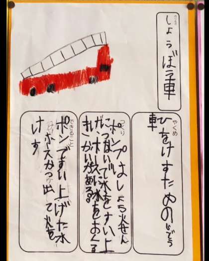 国語で勉強したいろいろな乗り物の発展学習として自分で選んだ乗り物について調べました。「やくめ」「つくり」「できること」についてしっかり書けています。
