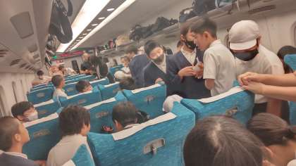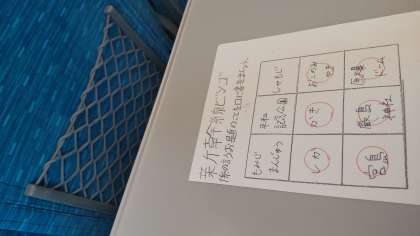 新幹線レクリエーション、「新幹線ビンゴ」お題は「広島と言えば?」です。ビンゴの人もたくさんいて盛り上がりました。
