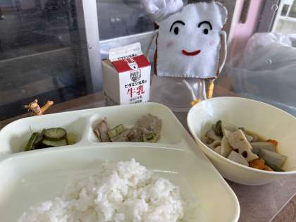 今日の給食は、豚肉のねぎじょうゆ焼き、ふきよせ煮、きゅうりの甘酢づけです。