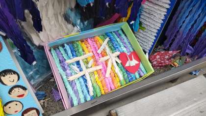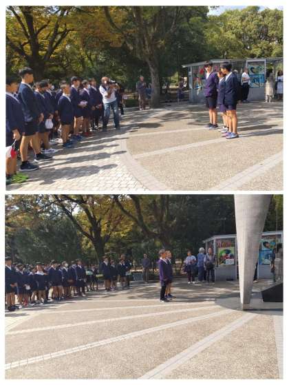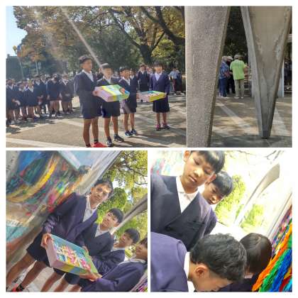 原爆の子の像の前で、慰霊祭を行いました。代表の人が平和の誓いの言葉の後、全校でおった千羽鶴を奉納しました。